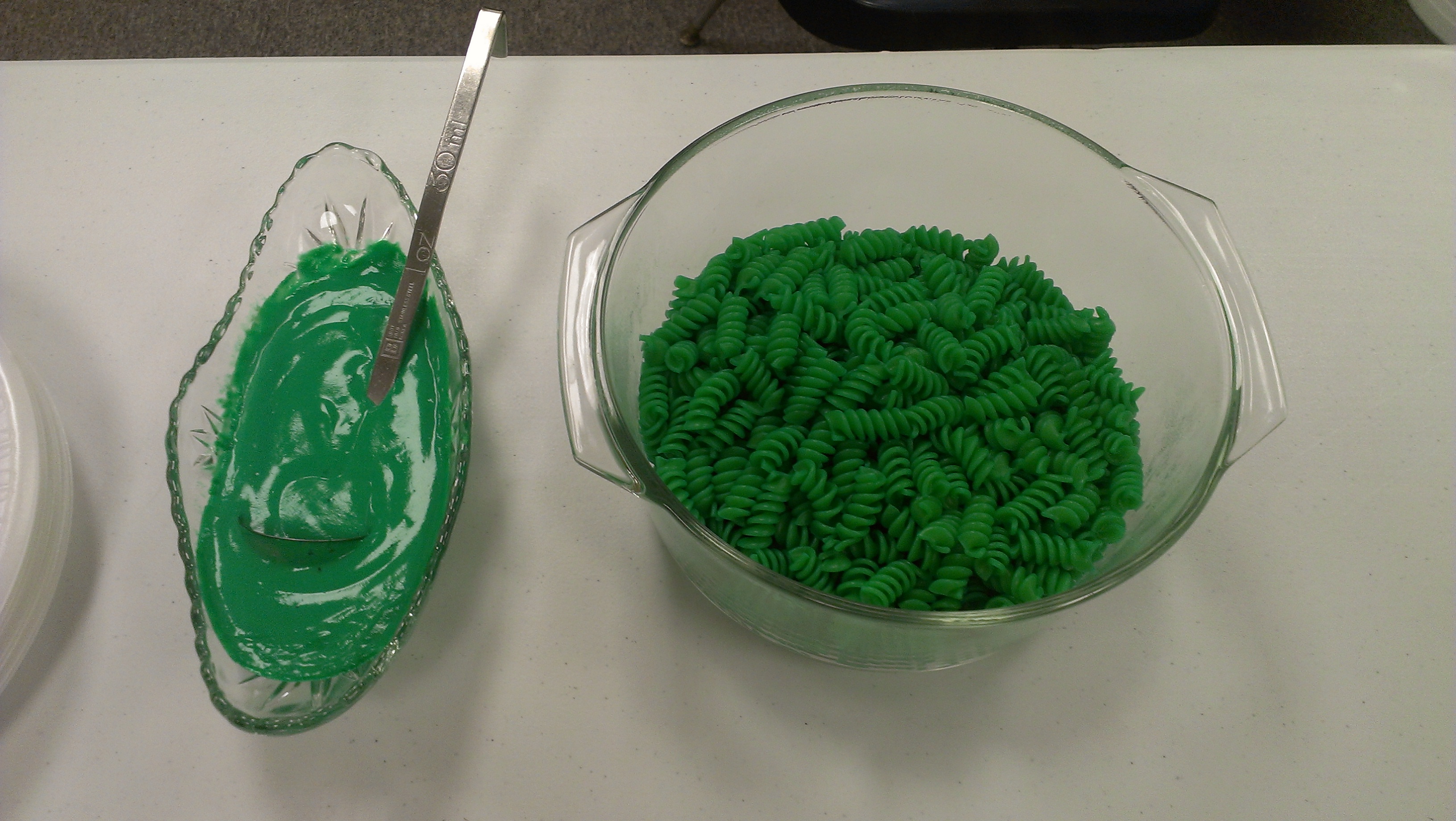 I did this for St. Patrick’s Day, but you can do it for any old occasion. A few drops of food coloring in the water when you make pasta will change the noodles in a very dramatic way! I used an Alfredo sauce with a few more drops, which really made the whole dish come together.